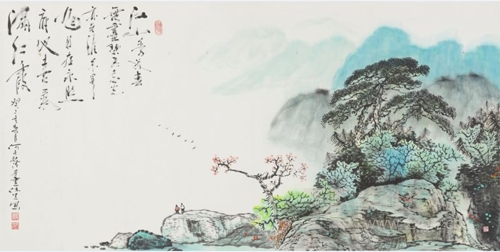 尤为令人动容的是,何阳先生用色亦呈现出一片澄明之境。不论草木之灵、山体之魂,或似有似无的山外之音,何阳先生都将山色浓情深深地融入进山水魂魄之中。最难能的是将山水风景间揉入一种风水玄机,平添几层耐人寻味的意境,山之势,水之流即能带来大运之势,拥之便可福禄旺之。无论是鲜明与淡彩,或是青黛与浅吟,何阳先生笔下的色彩与山水都能和谐地融为一体,予人一种宁静、舒畅、泊远、轻灵、自由之境。墨与色的交融与升华正体现了画家高超的技艺以及难能可贵的精神境地,也使我们在何阳先生的画作中找到了久违的灵性与感动。