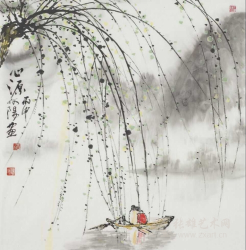 在何阳先生的笔下,常流动着郁郁葱葱的生命气息与山水情怀。在悠然、空灵、静谧的山色之中,涌动的是人们对大自然好山、好水、好风光,天下美景真情恒留人间的深深的眷恋。故其笔下不仅有奇山丽水、烟石飘渺,亦有小小人儿、渔船行进在这一片宁静瑰色之中。画家胸中涵养山水之气,墨黑如浓发,云深如沧海,俊色如丽歌,心境如碧波。画者化也,何阳先生化山川与笔墨,化笔墨为情怀,以情生境,以境化人,将真情与美好撒满人间。